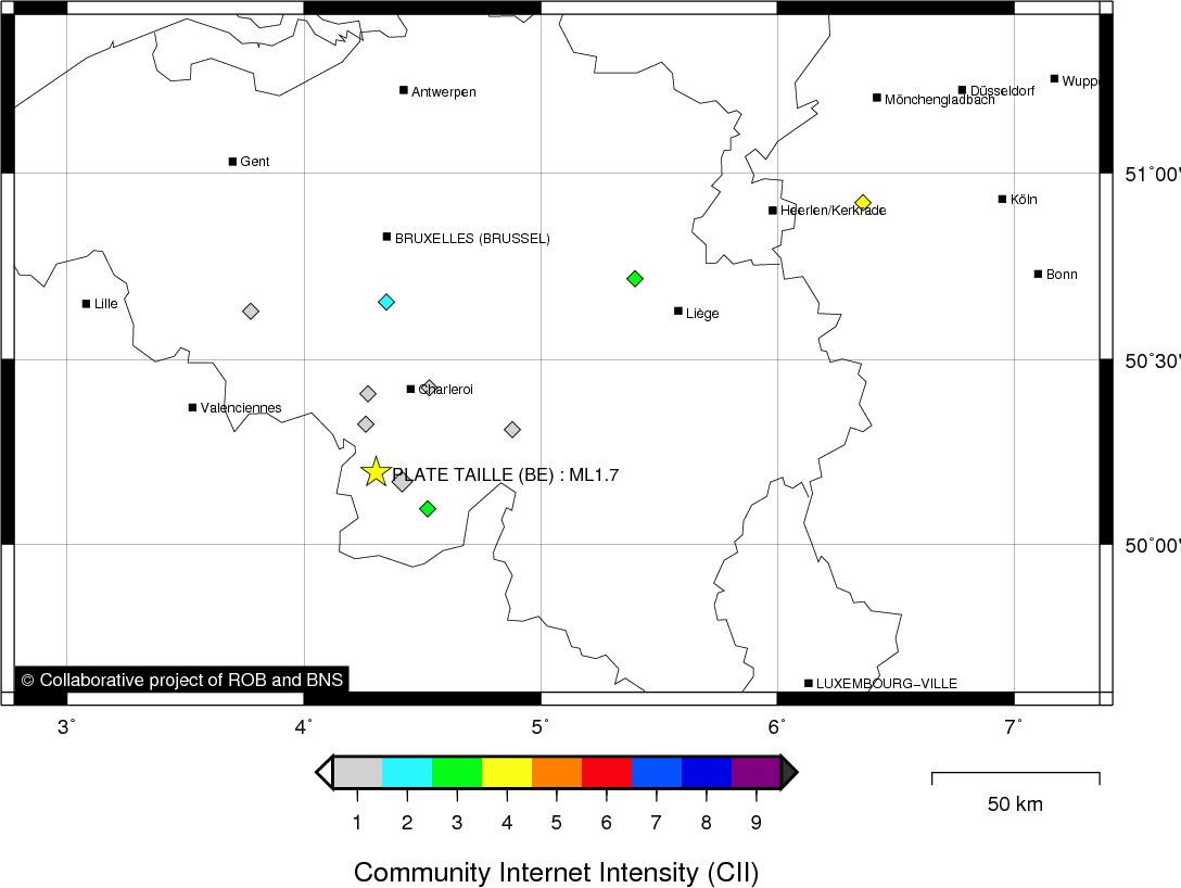 | Lage des Epizentrums | 50.195° N, 4.305° E Unsicherheit ± 1.8 km |