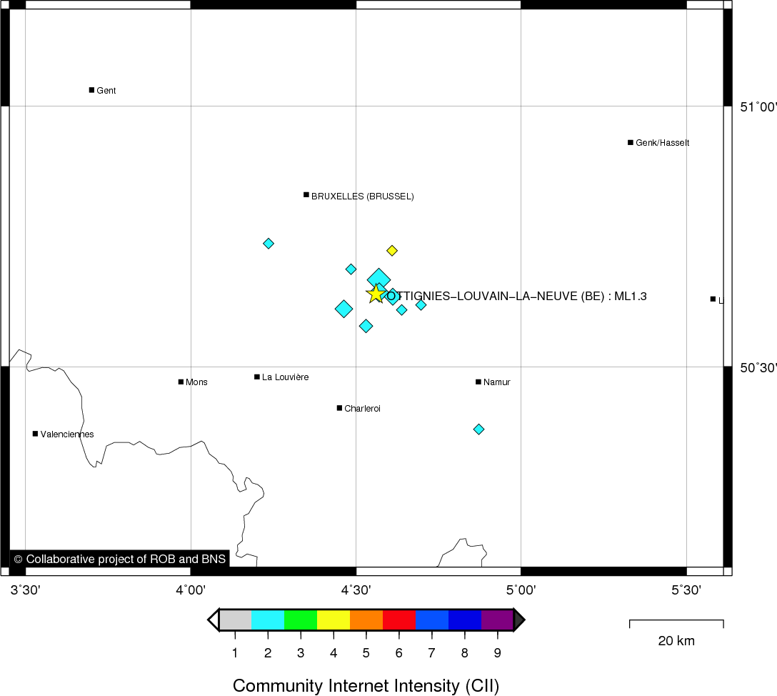 | Lage des Epizentrums | 50.640° N, 4.562° E Unsicherheit ± 1.0 km |