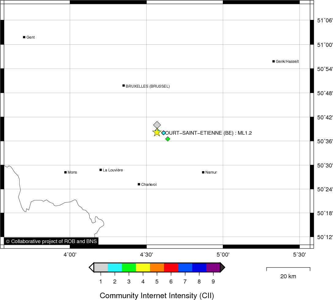 Epicentral coordinates 50.636° N, 4.569° E Uncertainty ± 0.7 km