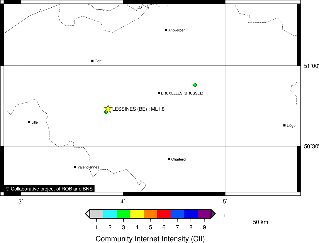 Epicentral coordinates 50.732° N, 3.852° E Uncertainty ± 3.6 km