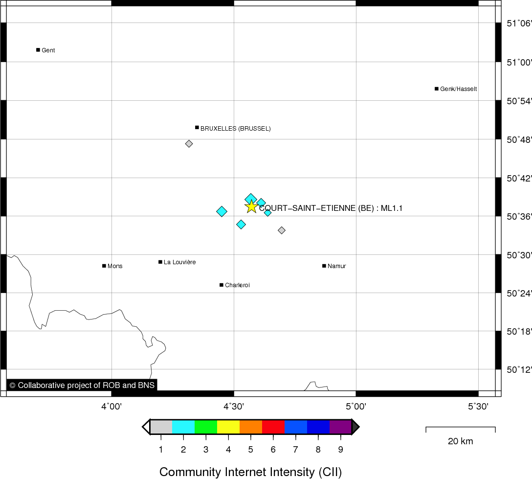 | Epicentral coordinates | 50.624° N, 4.574° E Uncertainty ± 0.7 km |