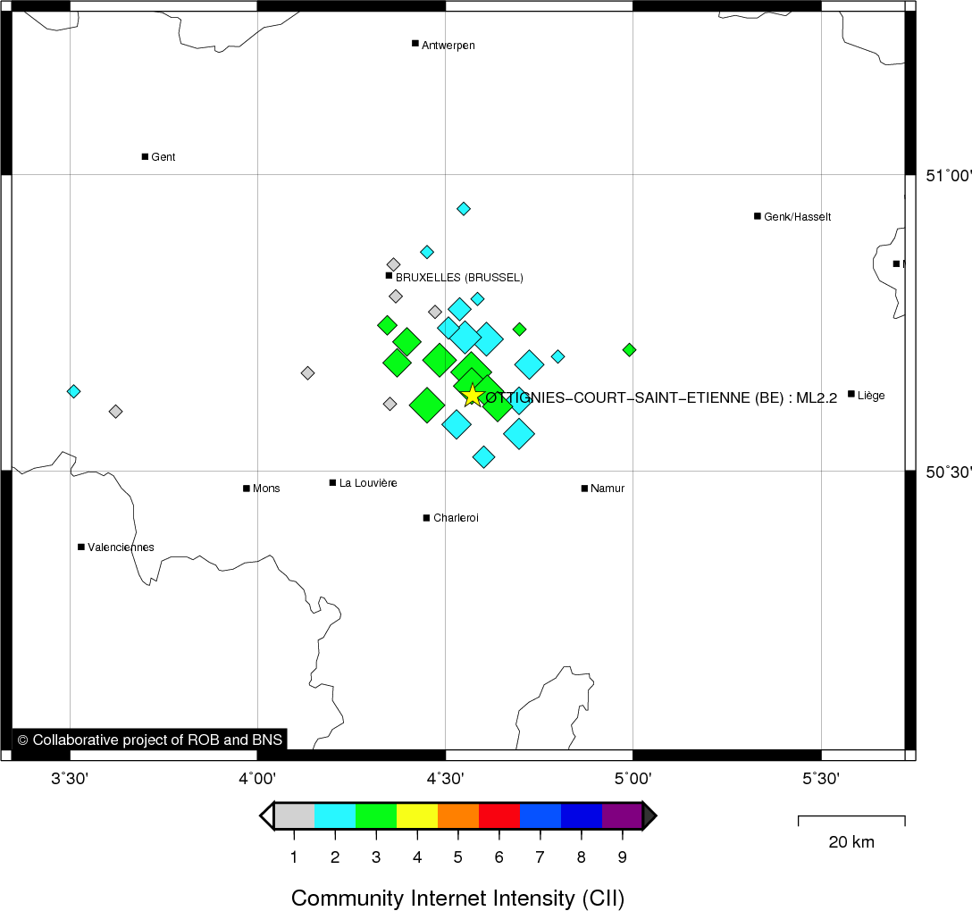 | Epicentral coordinates | 50.627° N, 4.572° E Uncertainty ± 0.6 km |