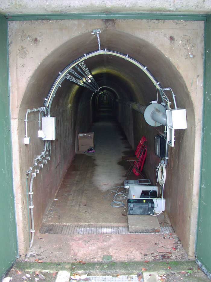 Figure 10: Entrée de la galerie creusée dans la colline à Membach, non loin du lac de la Gileppe. Au bout de ce couloir long de 130m, se trouvent les salles de mesure où sont installés plusieurs sismomètres ainsi qu'un gravimètre à supraconductivité. Au début du couloir on voit l'accéléromètre, installé en 2003.