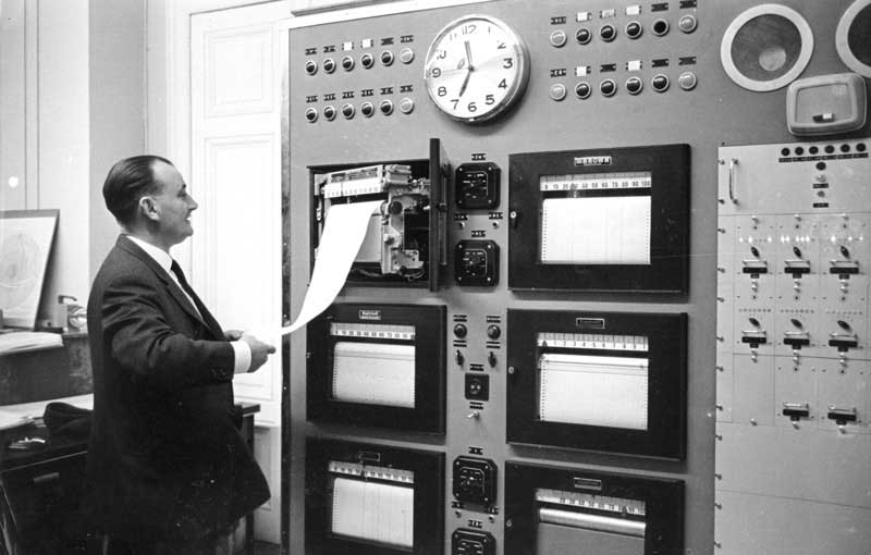 Figure 7: J.-M. Van Gils, en 1966, devant la "cabine de la sismologie" de l'O.R.B., où ont été effectués les enregistrements des sismomètres Wiechert de 1962 à 1970 et, ensuite, Sprengnether/Press-Ewing jusqu'en 1985. Les six enregistreurs permettaient d'enregistrer sans interruption pendant les changements de rouleaux les trois composantes Est-Ouest, Nord-Sud et Verticale du sismomètre.