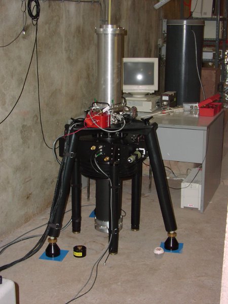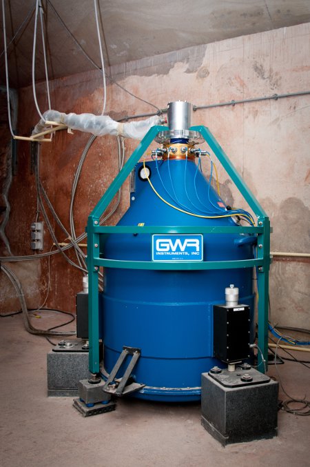 Figures : le gravimètre absolu FG5#202 déterminant la pesanteur à Membach avec une précision de 10-9 g. En fonction des saisons, la valeur de g y varie de 9,810 467 20 à 9,810 467 30 m/s2, après correction des effets variables connus tels les marées. Le gravimètre à supraconductivité GWR#C021 mesure en continu les variations de pesanteur à Membach depuis 1995 avec une précision meilleure que 10-10 g. Le gravimètre à ressort Scintrex CG5 est un instrument de terrain, qui mesure les variations de pesanteur avec une précision de 10-8 g.