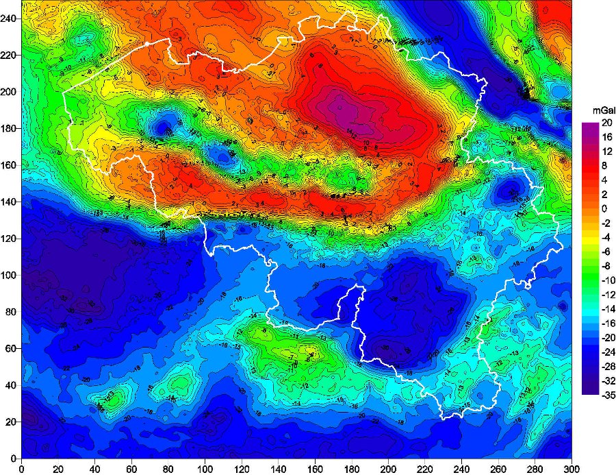 Figure : Anomalies gravimétriques (de Bouguer, en mGal [1 mGal $\Leftrightarrow$ 10 µm/s2 $\Leftrightarrow$ 0.001 g]) dans nos régions. Cette carte reflète les variations de densité des roches sous-jacentes. Elle permet une visualisation des grandes structures géologiques régionales. Le Massif du Brabant, formé de roches plus denses, est la partie rouge au nord-ouest de la carte. En bleu, on retrouve l’influence des roches moins denses de l’Ardenne et du Bassin de Paris. Le Graben de la Roer, en bleu au nord-est, est formé d’une accumulation de sédiments moins denses et plus récents.