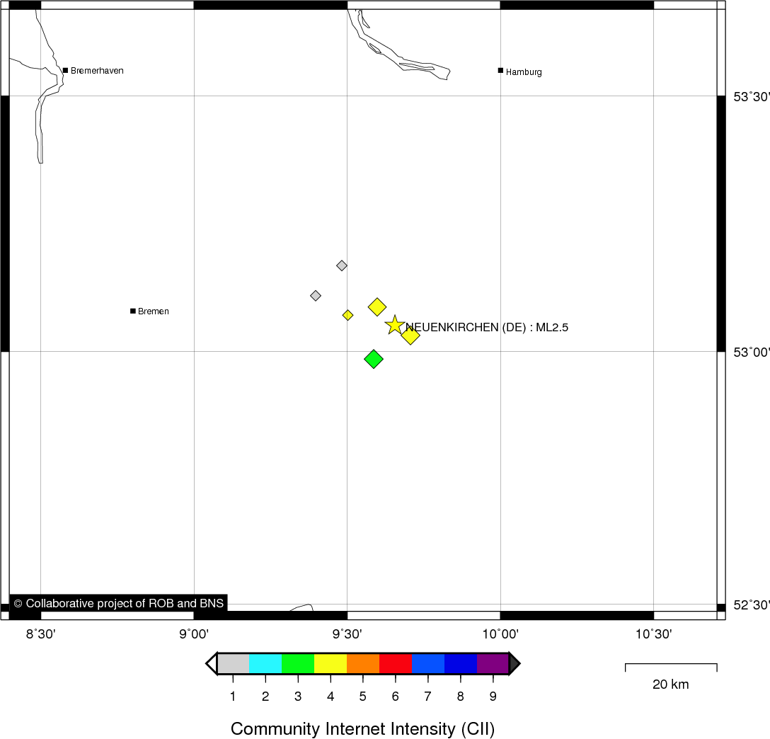 Coordonnées de l'épicentre 53.052° N, 9.656° E Incertitude ± 10.0 km