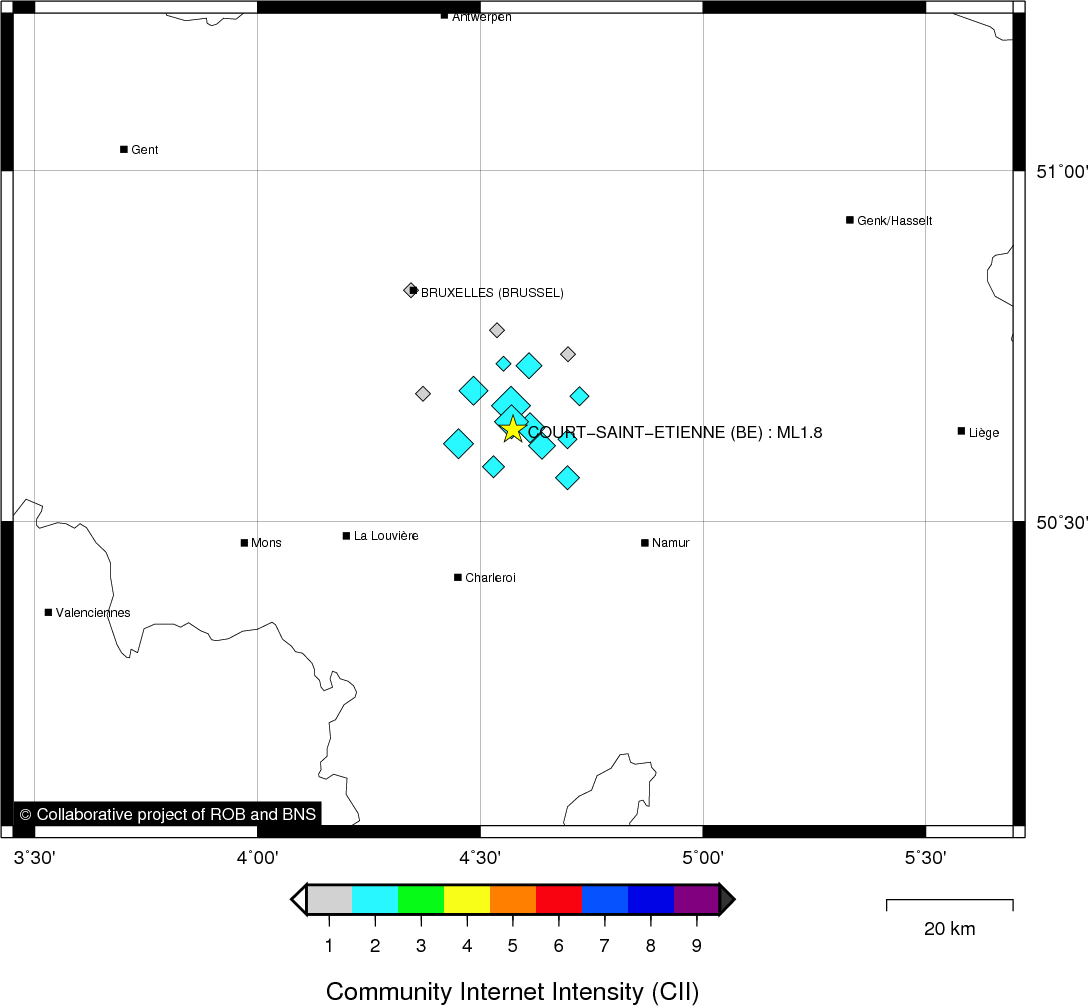 | Coordonnées de l'épicentre | 50.632° N, 4.574° E Incertitude ± 0.6 km |
