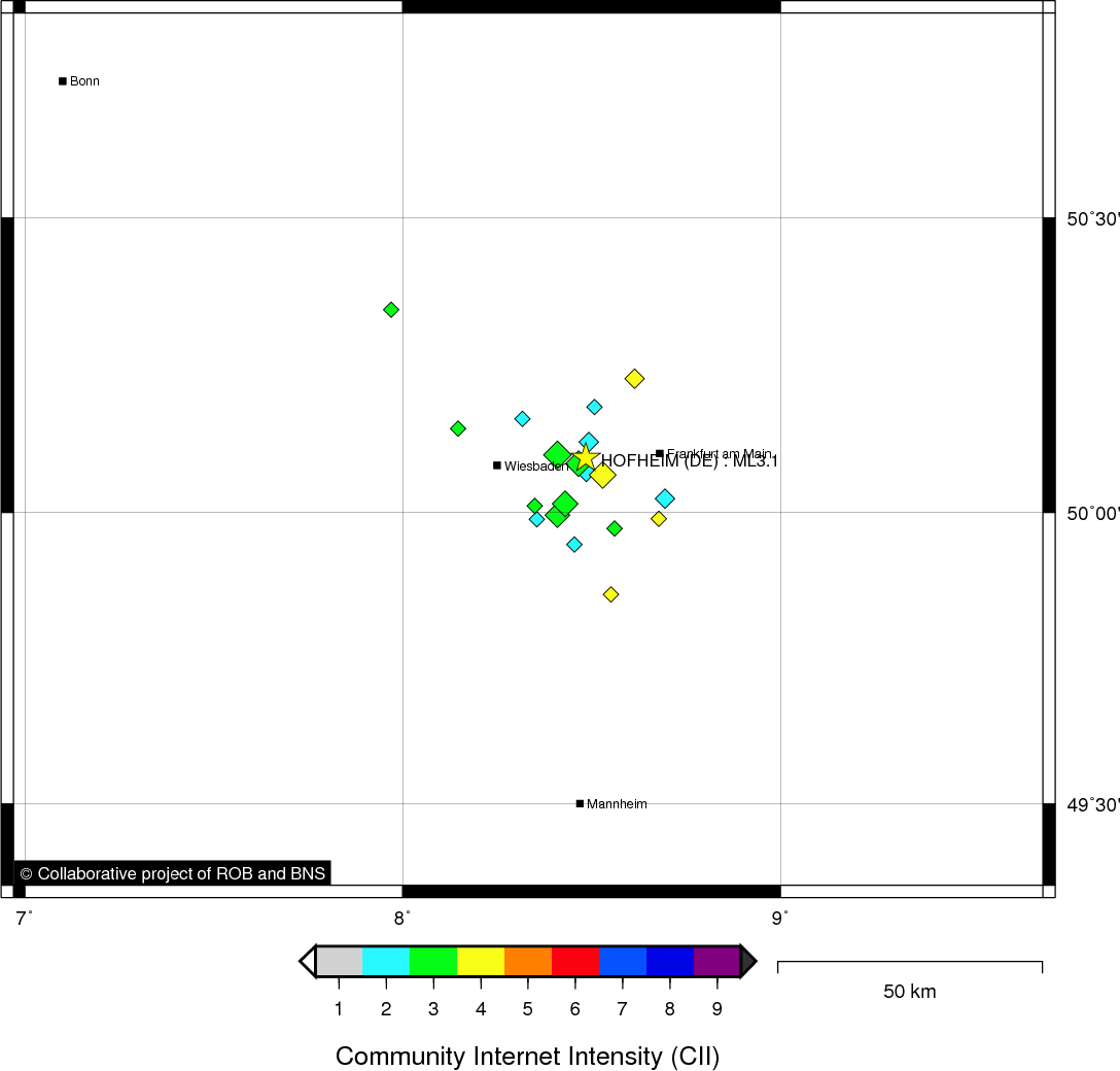 Coordonnées de l'épicentre 50.093° N, 8.485° E Incertitude ± 2.4 km