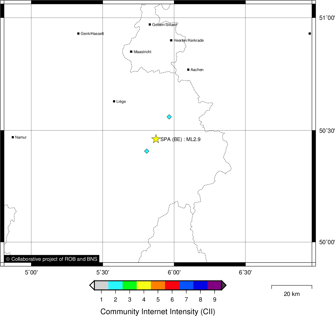 Metingen door het Duits seismometernetwerk van het aardbevingsstation Bensberg (Universiteit van Keulen, Duitsland)