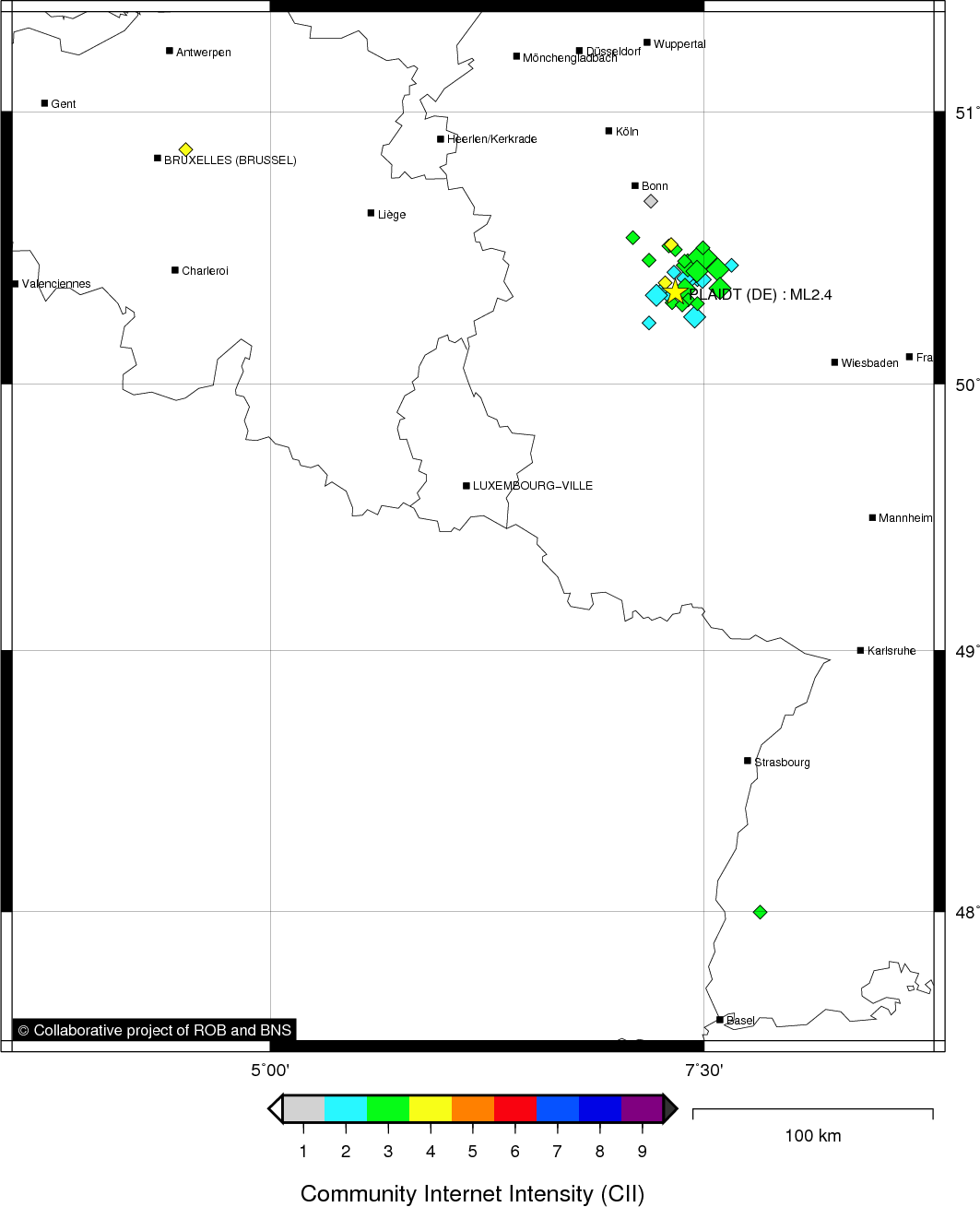 Waarschuwing! De intensiteiten afkomstig van de macroseismische enquête zijn ruwe gegevens die nog niet geverifieerd werden.