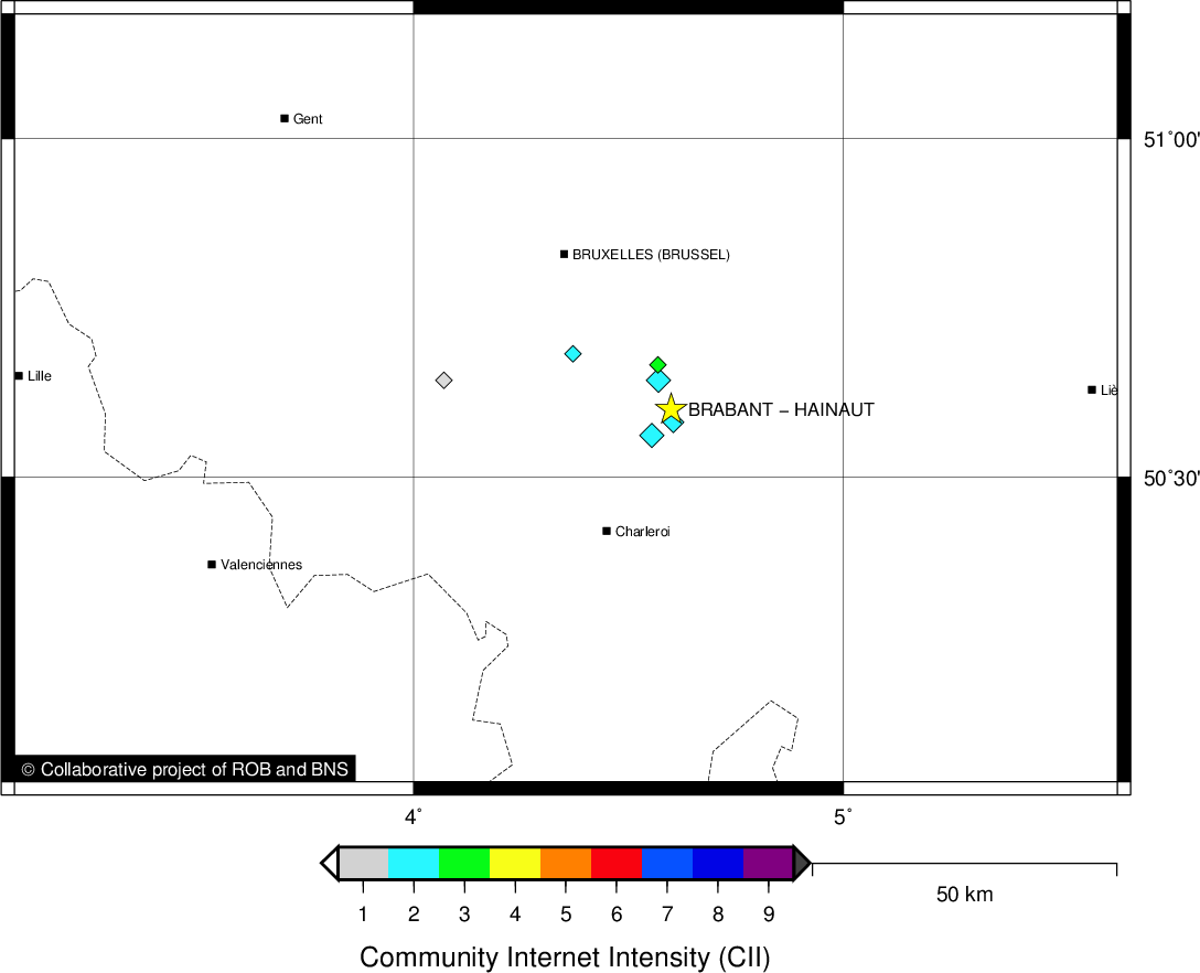 Waarschuwing! De intensiteiten afkomstig van de macroseismische enquête zijn ruwe gegevens die nog niet geverifieerd werden.