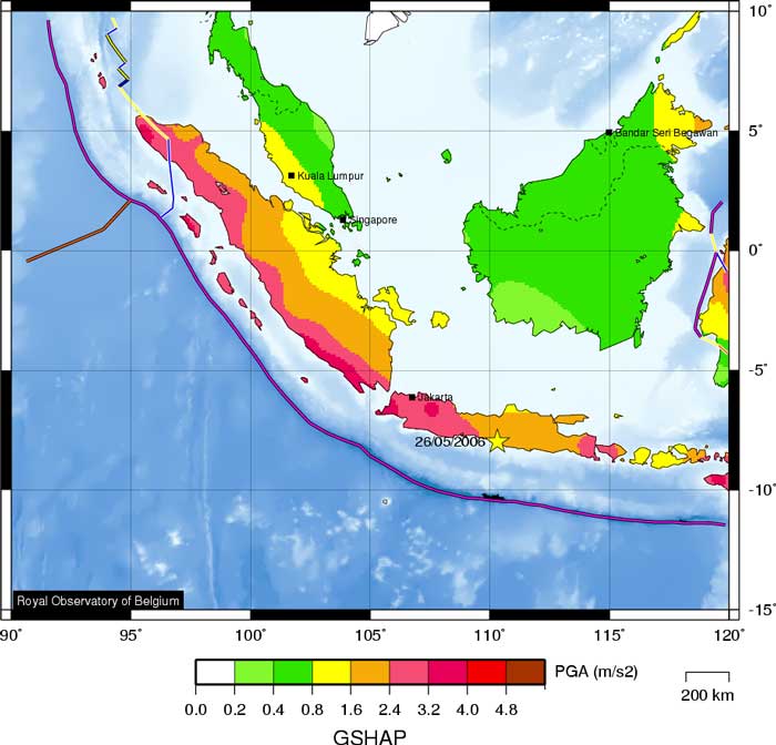 De kleuren op deze kaart stemmen overeen met de maximale grondversnelling die verwacht wordt overschreden te worden met een waarschijnlijkheid van 10% binnen een periode van 50 jaar. De oranje en rode kleuren op de Indonesische eilanden Sumatra en Java wijzen op een hoog aardbevingsrisico.