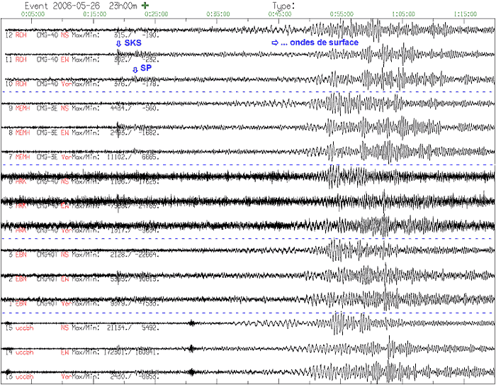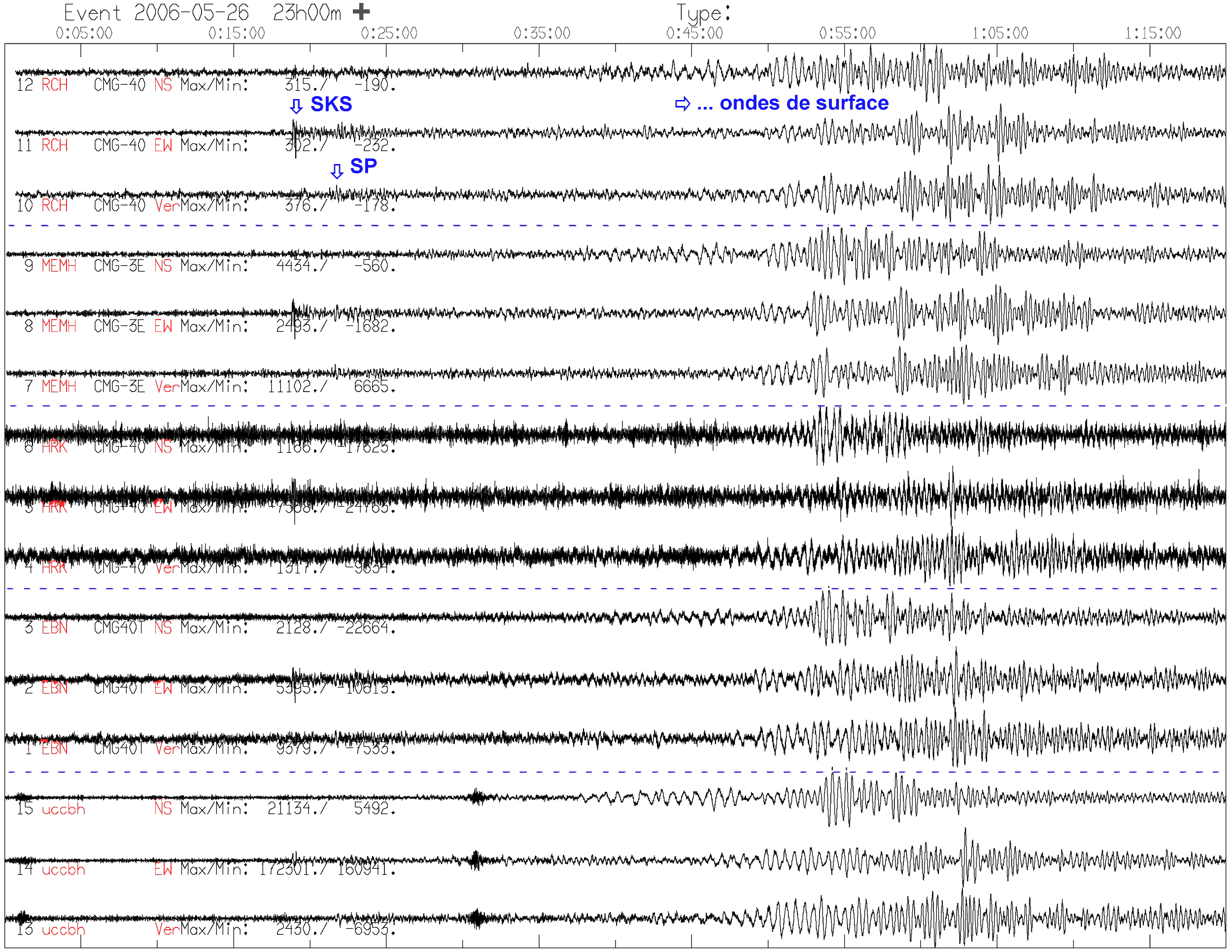 Registratie van de aardbeving door de breedbandstations van het Belgisch seismisch netwerk. De stationscodes en de component (NS: noord-zuid, EW: oost-west, Ver: verticaal) zijn in rood aangegeven. Merk op dat de registratie geen P-golven vertoont. Dit komt omdat het Belgisch netwerk zich in de zogenaamde "schaduwzone" bevindt, die wordt veroorzaakt door de invloed van de grens tussen de mantel en de buitenkern van de Aarde op het golftraject.