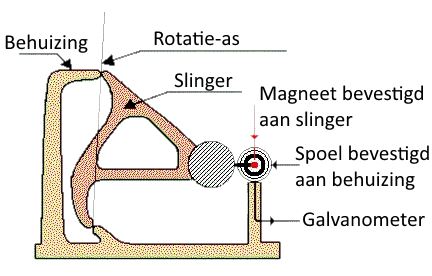 Bij de passage van een seismische golf zal de behuizing mee bewegen met de trillingen van de grond, terwijl de massa, door haar inertie en ophanging aan veren, de neiging zal hebben om stationair te blijven. We hebben dan te maken met een spoel waar omheen een magnetisch veld beweegt. De elektrische spanning die hierdoor wordt opgewekt aan de uiteinden van de spoel is evenredig is met de bewegingssnelheid van het magnetisch veld. Aangezien het magnetisch veld met de snelheid van de grond beweegt, verkrijgen we op deze manier een omzetter van grondsnelheid naar elektrische spanning (zie Fig. 2).