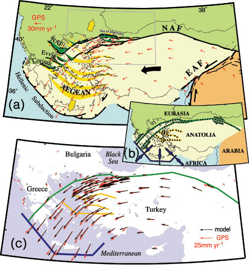 The Anatolian extrusion is similar to experiments in plasticine carried out by Peltzer et al. (C.r. Acad. Sci. Paris, 294, 1341-1348, 1982). The indentor is applied to a free boundary at the base and the system is free to move westward. As deformation evolves a left-lateral fault first appears in the east. It is then cross cut by a right lateral fault that propagates toward the free boundary in the west. The photograph is from the original experiment of Pelzer et al. (1982).